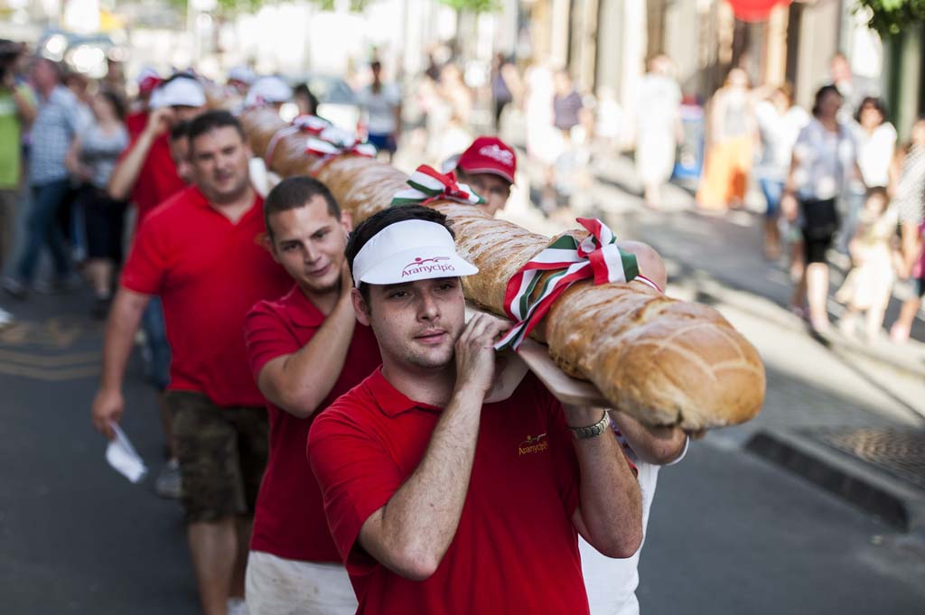Óriáskenyeret visznek a vállukon az Aranycipó Kft. dolgozói a pécsi Széchenyi téren a Magyarok kenyere ünnephez kapcsolódó Pécsi Pékfesztiválon 2014. augusztus 19-én. A 12,25 méter hosszú, 80 kilós kenyeret a kft. pécsváradi üzemében készítették. MTI Fotó: Sóki Tamás