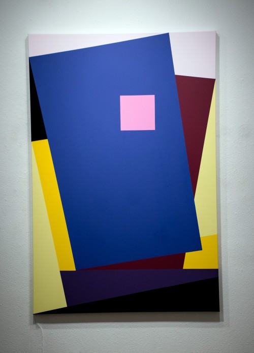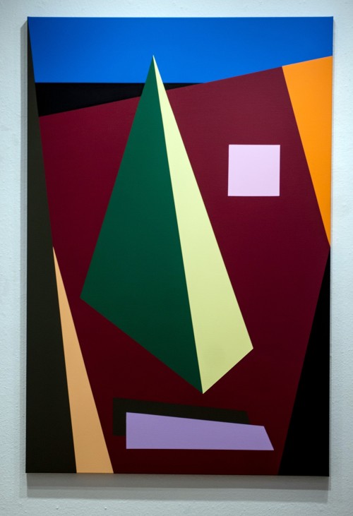 A zöld és sárga háromszöget tartalmazó kép dinamizmusa, a formák megbillentése ellenére is egyensúlyban van, ami vonzza a tekintetemet. A háromszög kiáll a síkból, fölfele tör, tornyot szimbolizálva. Lehetne az isten háza, isten házának tornya is. Ez nyilvánvaló asszociációs hatás, mert a képi valóságban nem látni sem templomot, sem istent. Eget és földet sem. A kék szín magát az eget jelentheti, sőt magát a tengert, a távolságot, a messzeséget, a távlatot, egyben az időt és az utat, mert ebbe a kékségbe bele lehet veszni, mély és távoli egyszerre. Ugyanakkor a nyugalom szigete, sávja is. A szabálytalan, sérült téglalap őrzi az enyhe lila színű négyzetet és az azt tagadó nem-négyzetet, egy testen belül. A kép kompozícióját a fekete, éles háromszögek teszik izgalmassá. A fekete itt nem a gyász színe, hanem határoló test és vonal, alapozó, a szilárdság színe. A kép jobb felső oldalán megjelenő narancssárga szín a visszacsatolás színe, befutó és behatoló testé. Szervesen illeszkedik a meleg barna színhez. A narancssárga háromszöggel ellentétesen mozog, tart irányt a kép alsó sarkában lévő sárga színű háromszög. A világos és a sötétebb színek egyensúlya teszi üdévé a képet.