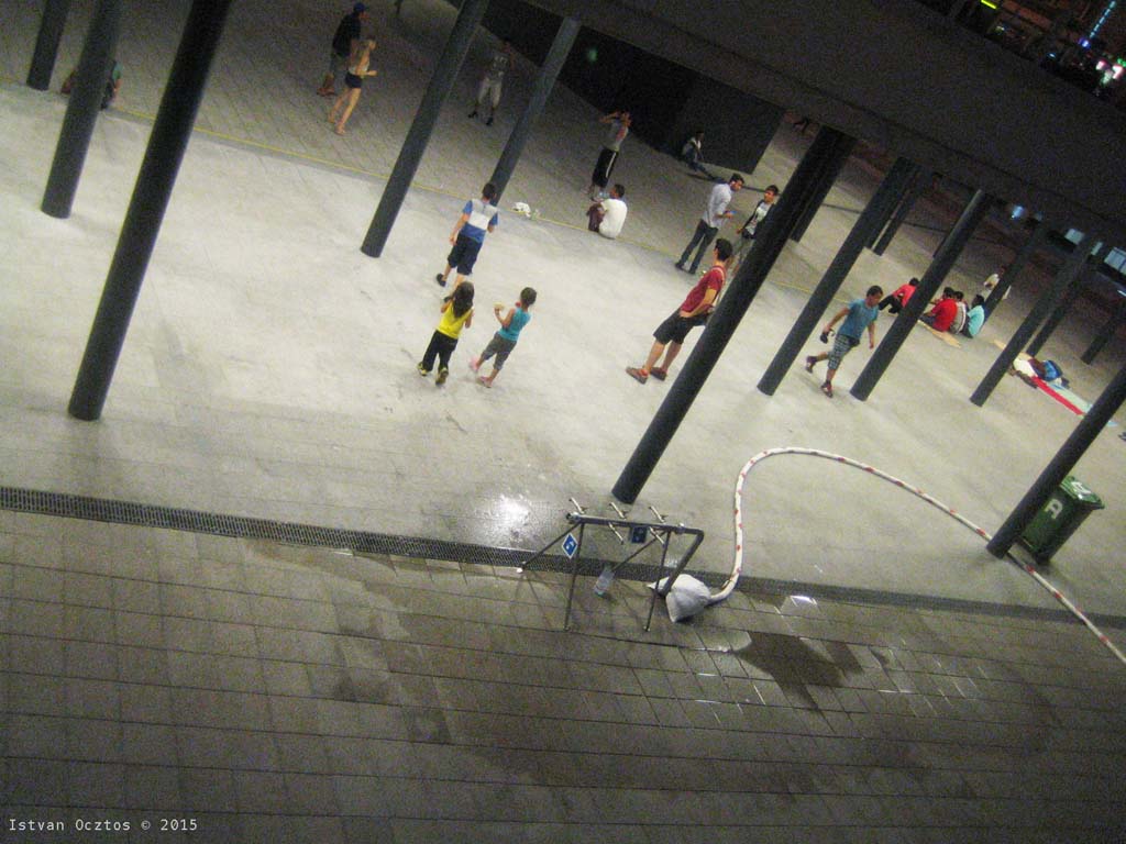 Már teljesen besötétedett, mire a II. János Pál pápa térre értem. A füvön kisebb csoportokban emberek üldögéltek, heverésztek, beszélgettek, pokrócokon, ruhákon. A gyerekek szaladgáltak. Az egyik padnál megállt néhány fiatal, s hamarosan köré sereglettek az emberek, szépen. Kis műanyag edényekben, műanyag kanállal osztottak valamiféle ételt.