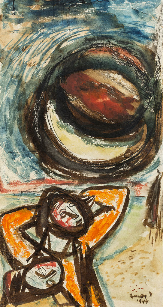 Ami Radnóti Miklósnak a Bori notesz, az Ámos Imre festőművésznek a Szolnoki vázlatkönyv. Még a munkaszolgálat borzalmai sem akadályozhatták meg abban, hogy megörökítse apokaliptikus vízióit, lángokkal, angyalokkal és a kereszten szenvedő Krisztussal. Kopin Katalin művészettörténészt a most megnyílt Cinóber alkony című kiállításról kérdeztem, amely a gazdag és hatalmas ívet leíró életmű utolsó szakaszát, a világégés és az üldöztetés közegében keletkezett képeket helyezi a középpontba.