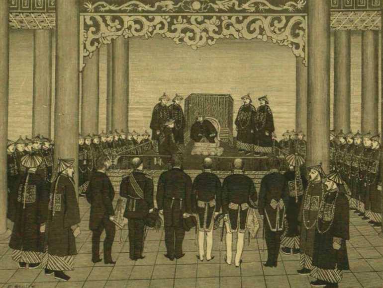 „Az ünnepélyes fogadáson a diplomatákat először Kong herczeg, az uralkodó nagybátyja vendégelte meg s csak azután vezette be őket reggel 1/2 9 tájban a trónterembe, midőn a császár kíséretével már helyet foglalt. E terem fehér márványoszlopokkal bíró nyilt terraszhoz hasonlított, melyből jó távol lehetett látni s öt nagy kapuja volt. A lépcsők fölött 10 testőr állott párduczbőr-ruhában. A terem északi emelkedett részén volt a trón, hol a fiatal beteges fejedelem ült s oldalánál négy fejedelmi herczeg állott. A trónemelvényhez három lépcső vezetett s az egész aranyozott rácsozattal volt körülvéve. Maga a trón aranyozott fából készült s rajta sárga párnák, oldalt egy fölakasztott kard khinai fölirattal. A trón mögött volt egy fekete föliratos kő s rajta különböző illatszerek.”