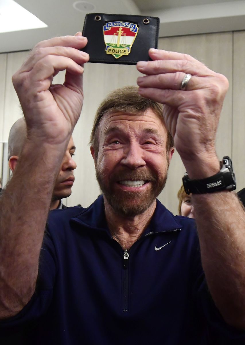 Chuck Norris amerikai színész és felesége, Gena O’Kelley mutatja a Walker, a texasi kopó című tévésorozatban viselt, árverezésre szánt kalapot és az eredetiségi tanúsítványát a Baptista Szeretetszolgálat Cipősdoboz adománygyűjtő akciójához kapcsolódó sajtótájékoztatón a budapesti Kempinski Hotel Corvinus szállodában 2018. november 26-án. MTI/Kovács Tamás
