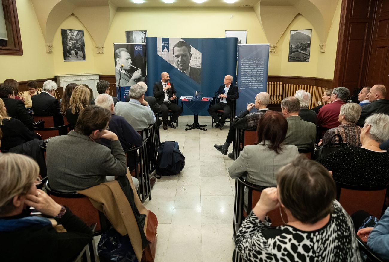 Bednanics Gábor irodalomtörténész (b) és Hafner Zoltán, a kötet szerkesztõje, a Kertész Imre Intézet igazgatója beszélget a Kertész Imre mûvei címû bibliográfia bemutatóján a Fõvárosi Szabó Ervin Könyvtárban (FSZEK) 2020. február 20-án.