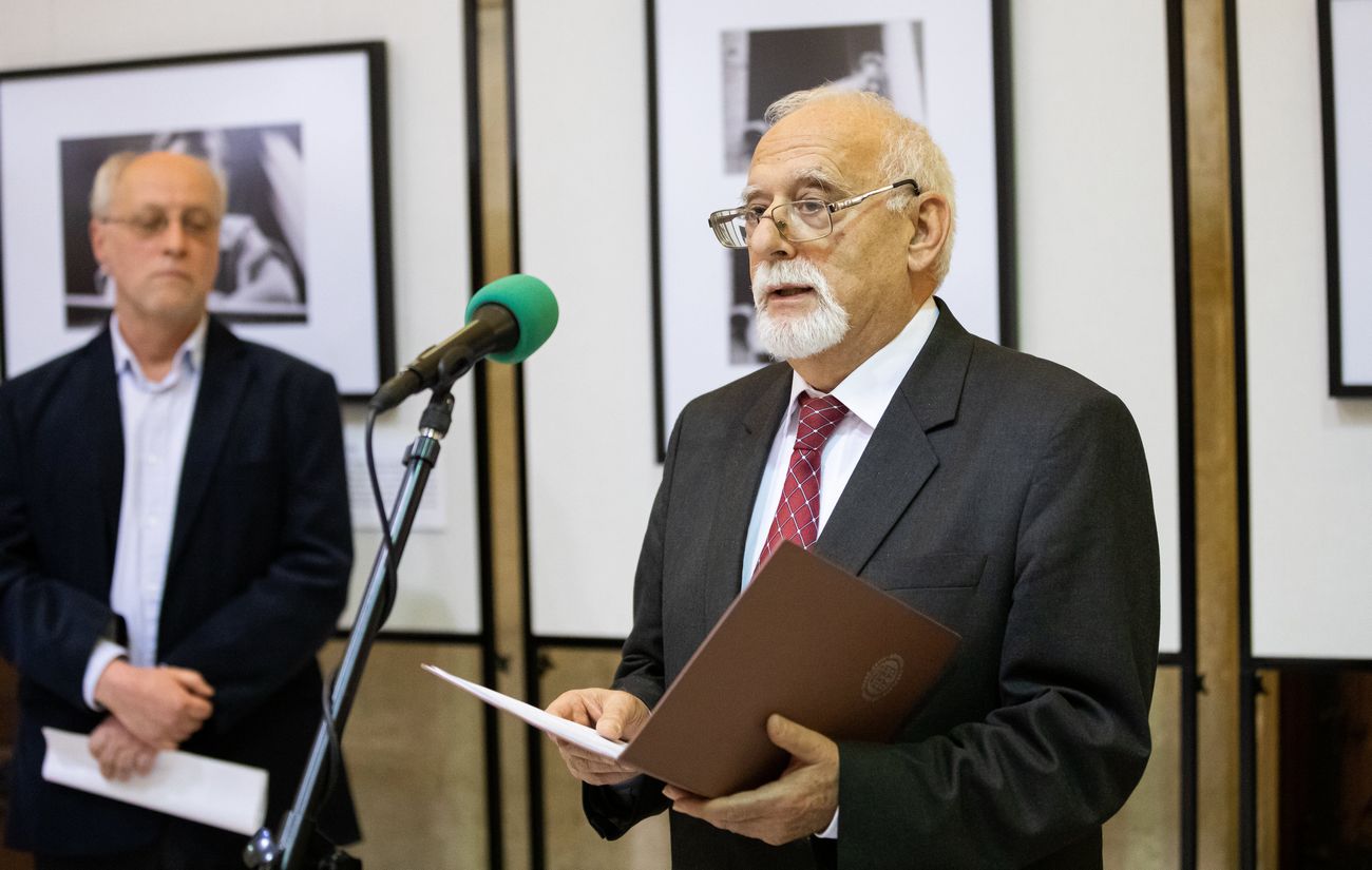 Fodor Péter, a Fővárosi Szabó Ervin Könyvtár (FSZEK) főigazgatója beszédet mond Kertész Imre Nobel-díjas író tanulóéveit bemutató, a Kertész Imre Intézet utazó tárlatán a FSZEK auditóriumában a megnyitó napján, 2020. február 20-án. Balról Hafner Zoltán, a kötet szerkesztője, a Kertész Imre Intézet igazgatója. Az ismeretlen Kertész Imre – Tanulóévek 1934-1955 című vándorkiállítás részben eddig kiadatlan fotókon és vallomásokon keresztül, digitális tartalmakkal kiegészülve tekinti át az író tanulóéveit. A kiállítás március 27-ig tekinthető meg.