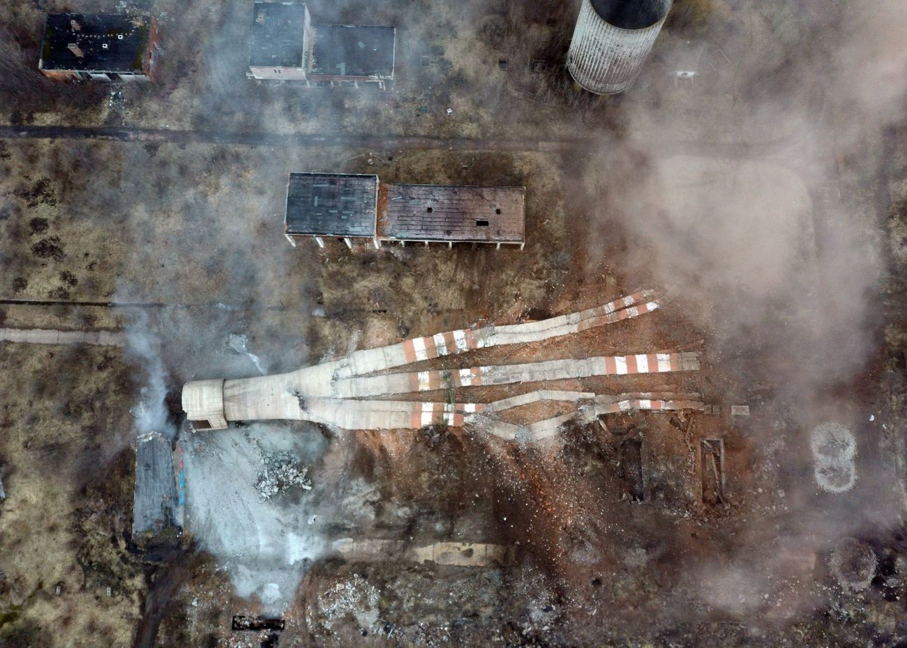 Robbantással döntik le az egykori Borsodi Ércelőkészítő Mű 106 méter magas kéményét Szirmabesenyőben 2020. március 6-án.