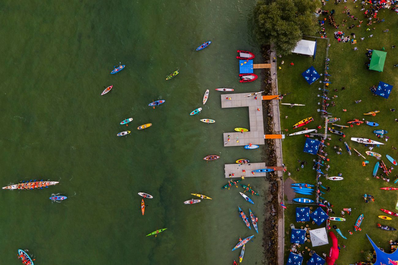 A Balaton-átevezés résztvevői Fonyódnál 2020. augusztus 16-án. A versenyzőknek 9 kilométeres távot kell teljesíteniük Fonyódtól Badacsonyig és vissza.