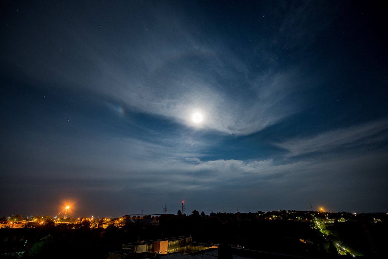Halojelenség a Hold körül, balra mellékhold Pécsről fotózva 2020. október 2-án.