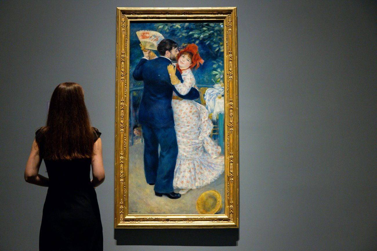 Látogató nézi Renoir a Vidéki tánc című festményét a francia impresszionista mester számos főművét bemutató tárlat sajtóbemutatóján a Szépművészeti Múzeumban 2023. szeptember 21-én. Első alkalommal nyílik Magyarországon Pierre-Auguste Renoir életművét bemutató, átfogó kiállítás Renoir – A festő és modelljei címmel, amely január 7-ig tekinthető meg.