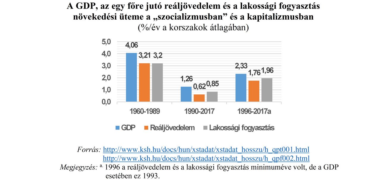 Nézzük először a lakossági reáljövedelmek és az egy főre jutó fogyasztás alakulását! Az alábbi táblázat azt mutatja, hogy a GDP (bruttó hazai termék), a lakossági reáljövedelem és a lakosság fogyasztása sokkal gyorsabban nőtt a „szocialista” korszakban, mint az újkapitalizmusban. Ez még akkor is igaz, ha – mint látható – a „rendszerváltási sokk” utáni stabilizálódástól (1996-tól) nézzük az említett mutatószámok növekedési ütemét