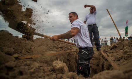 Kézi kaszás aratóbemutató és -verseny Törökszentmiklóson 2022. július 2-án. A helyi csapatok mellett a vajdasági Zenta hagyományőrzői is részt vettek az aratáson, a kárpátaljai Nevetlen faluból a háború miatt csak a nők tudtak eljönni a rendezvényre. MTI/Mészáros János