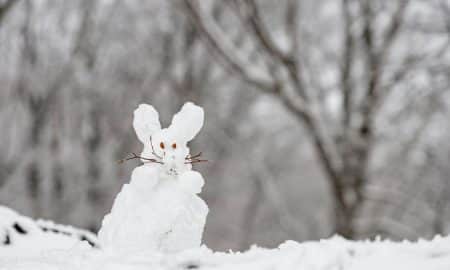 Hóból formázott nyúlfigura a nagypénteki Galyatetőn 2023. április 7-én. MTI/Komka Péter